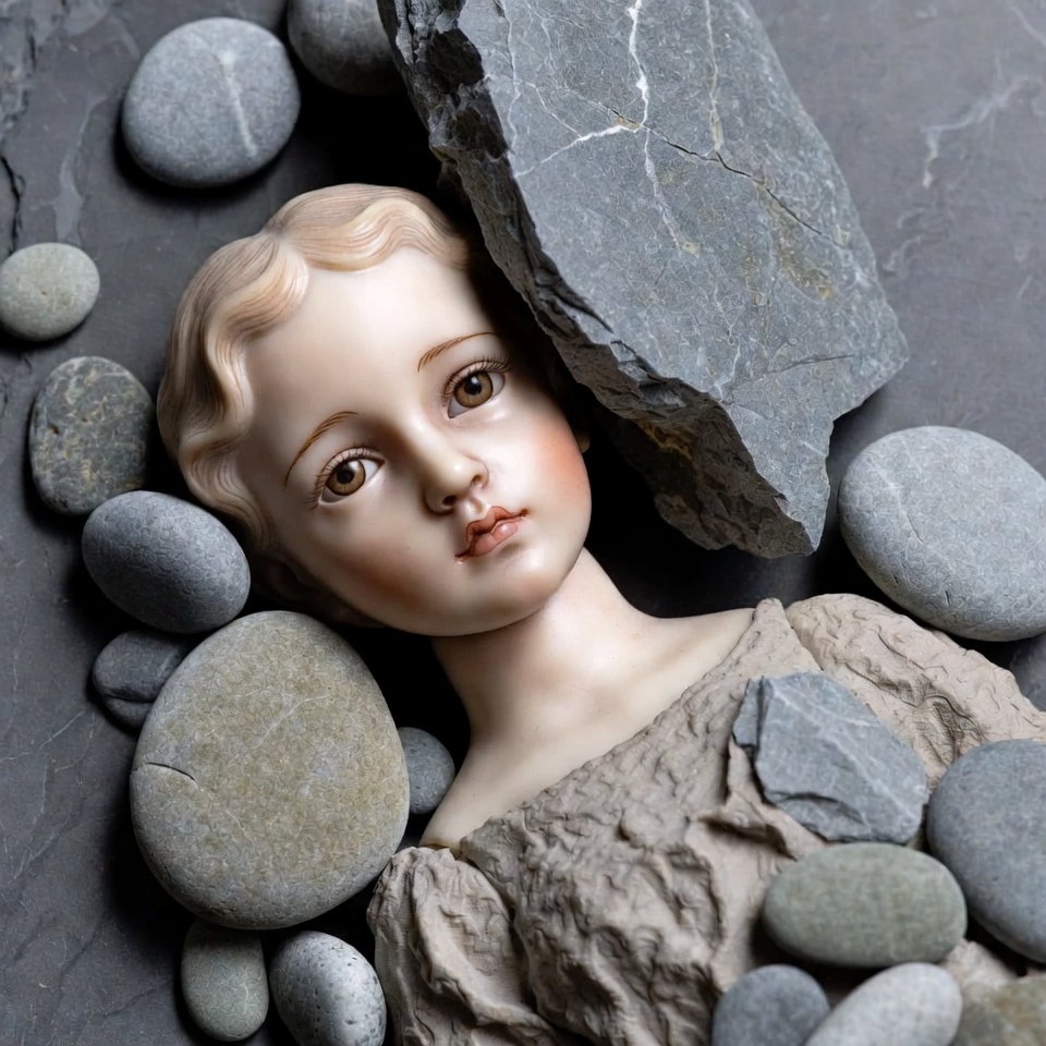A porcelain doll with wavy blonde hair and delicate facial features lies on a bed of gray pebbles and large rocks. She wears a beige dress with a high collar and is positioned with her head resting against a prominent rock. The scene features various sizes of smooth gray stones surrounding the doll.