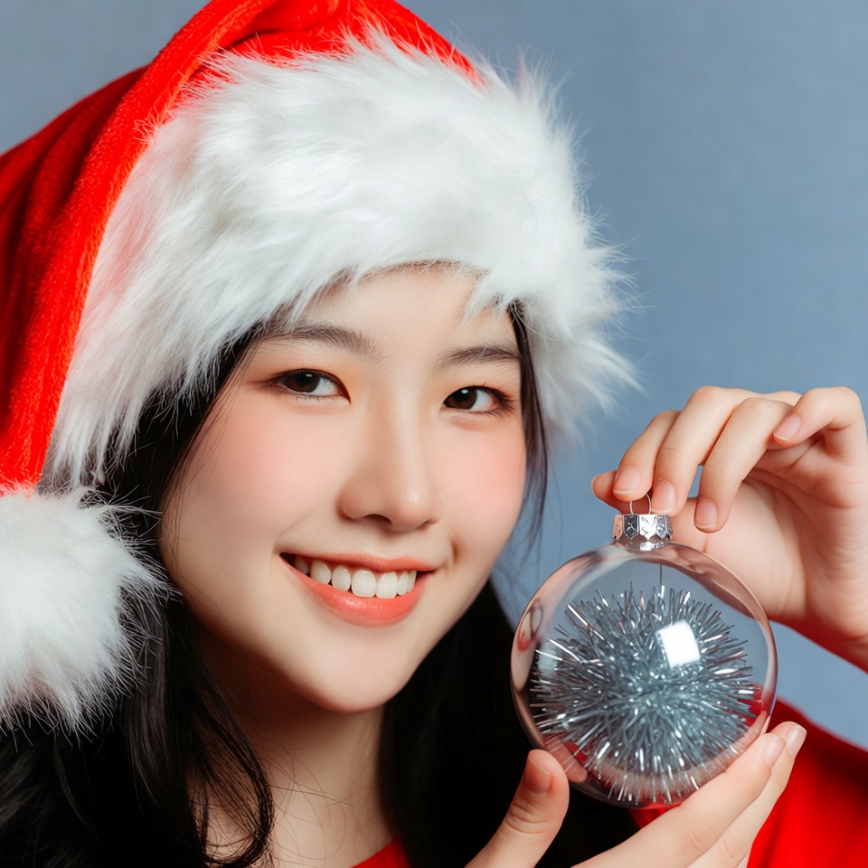 A young Asian woman with long black hair smiles while wearing a red Santa hat with white fur trim. She holds a shiny silver spiky Christmas ornament in her hands against a blue background. Her makeup is natural with pink cheeks and glossy lips.