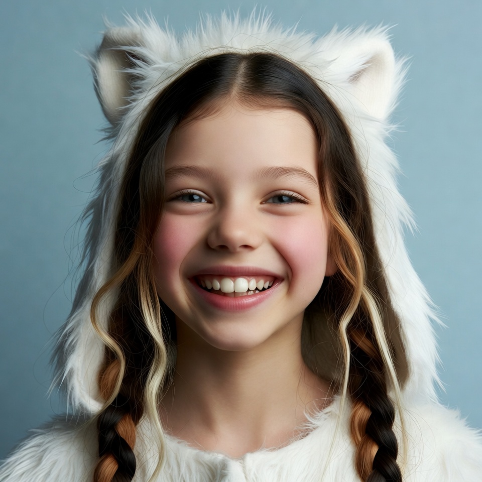 A young girl with long brown hair in braids smiles happily while wearing a fluffy white cat ears hood. She has bright blue eyes and rosy cheeks, posed against a light blue background. The hood features soft white fur and cat ears.
