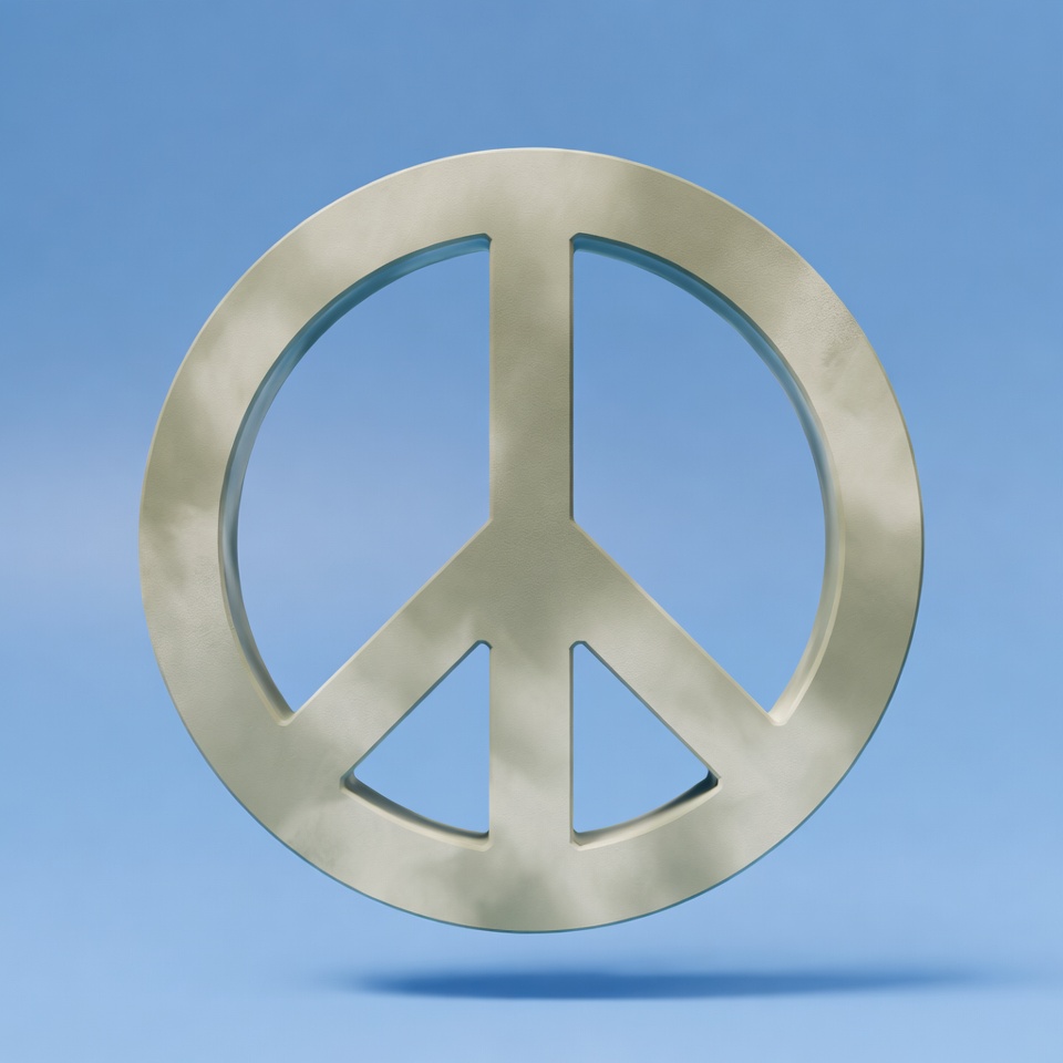 A three-dimensional gray peace symbol floats against a solid blue background. The symbol features a subtle gradient and metallic texture with soft shadows. It is centered and isolated for clear visibility.