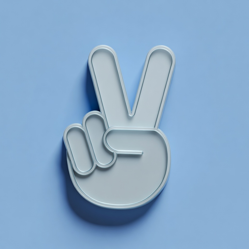 A three-dimensional gray peace sign hand gesture is rendered in a smooth, glossy style. It features two extended fingers forming a V shape with the thumb tucked in, against a solid blue background. The design has a modern, minimalist 3D appearance.