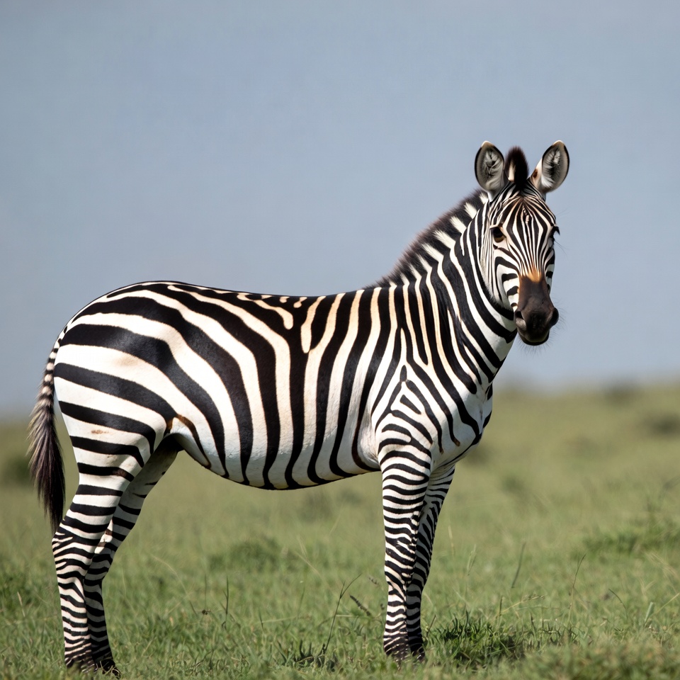 animal, black white, blue sky, ears, field, grass, nature, outdoors, savanna, side view, standing, stripes, tail, wildlife, zebra