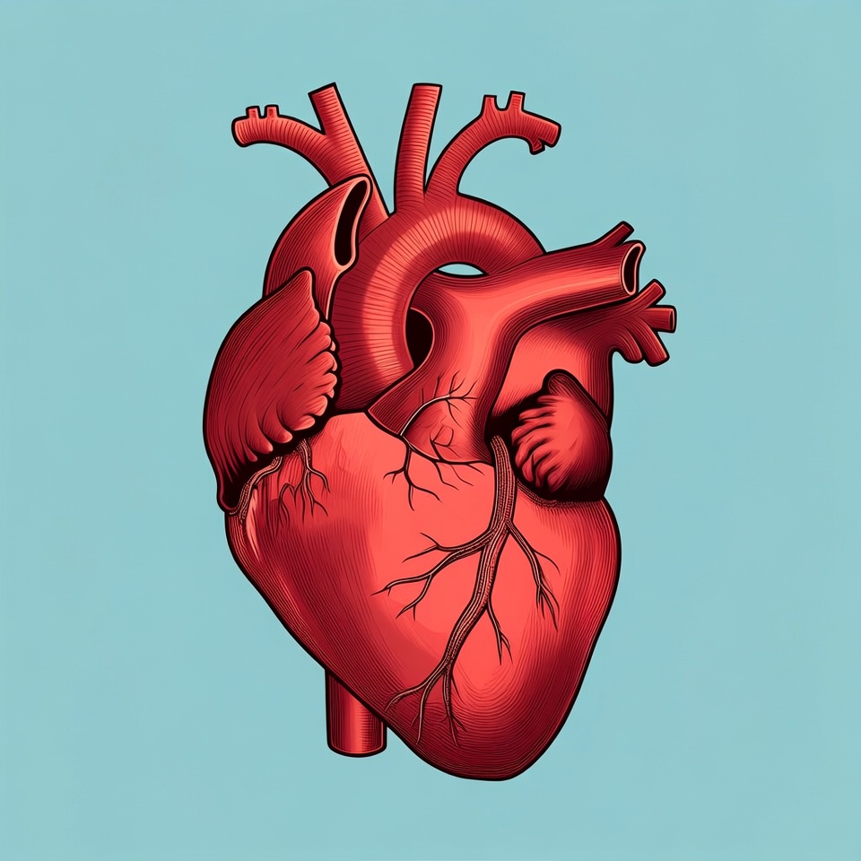 A detailed red human heart illustration features prominent ventricles, atria, and major blood vessels. It is depicted with realistic shading and textured lines on a solid light blue background. The anatomical structure is centered and isolated.