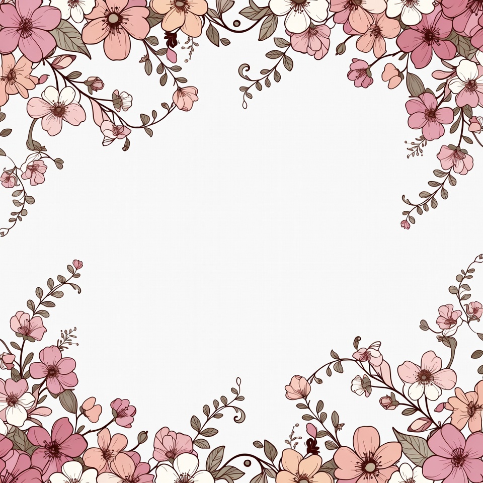 A delicate floral border illustration features various pink, peach, and white flowers with green leaves and vines. The flowers form a symmetrical frame around a large empty white space in the center. The design has a hand-drawn, watercolor style with soft edges.