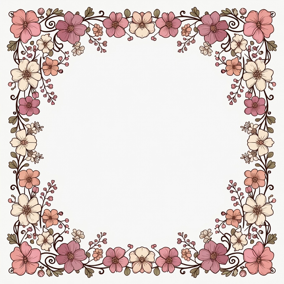 A decorative floral frame features pink and white flowers with green leaves arranged in an ornate border. The design forms a perfect square with an empty white space in the center. The illustration has a hand-drawn, whimsical style.