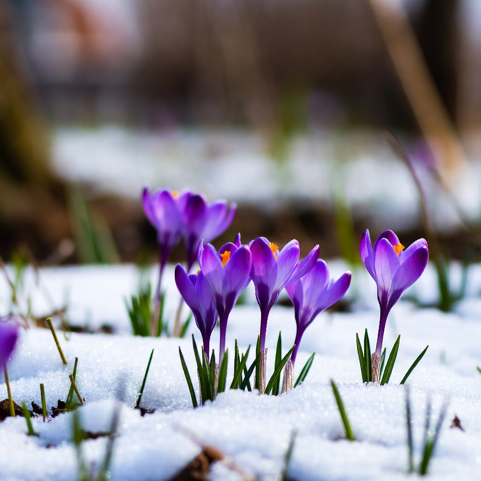 blooming, closeup, cold weather, early spring, flora, flower cluster, fresh snow, green stems, macro, nature, orange centers, outdoor, petals, plant shoots, purple flowers, snow, spring flowers, white snow, winter, crocus