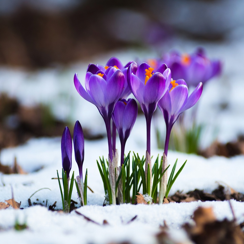 blooming, brown leaves, cold weather, crocus flowers, flower buds, flower cluster, garden, green stems, isolated background, nature, orange stamens, outdoor, purple flowers, snow, spring flowers, white snow, winter, crocuses