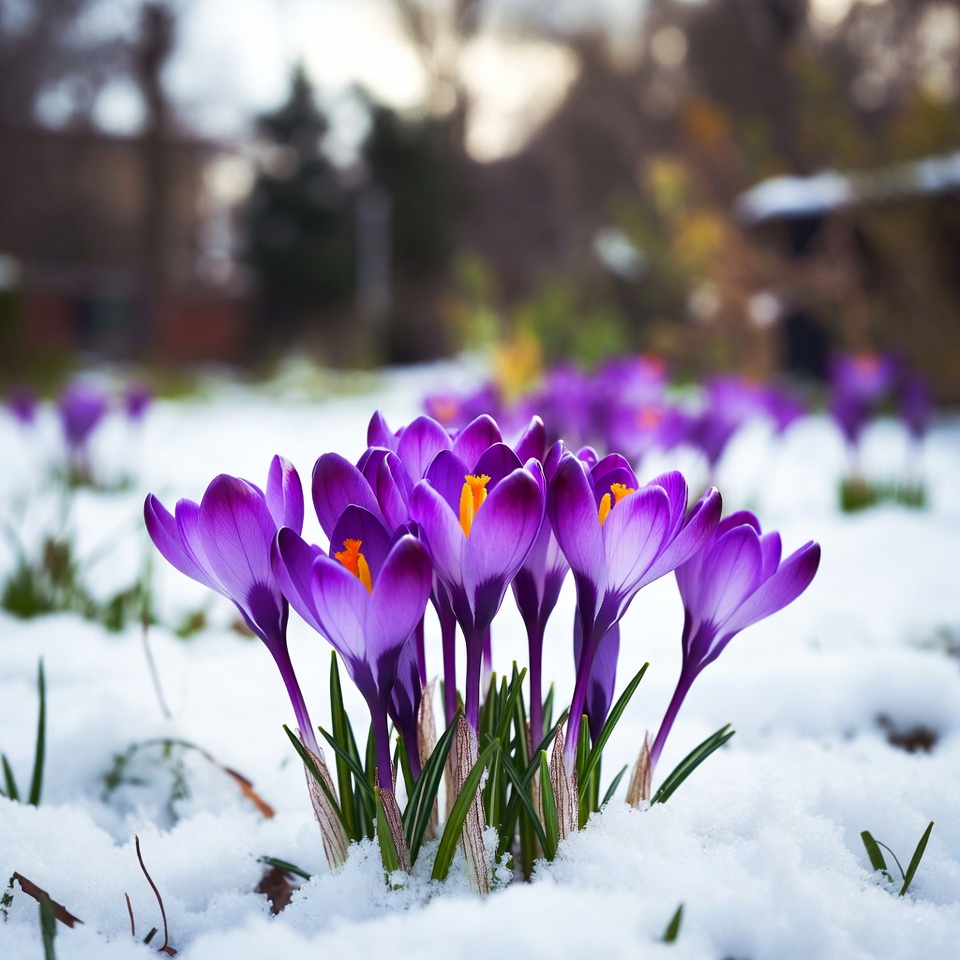 blooming crocus, blurred background, cold weather, crocus flowers, early spring, floral, flower cluster, fresh snow, garden, green stems, macro photography, nature, outdoor, petals, plants, purple flowers, snow, spring flowers, sunlight, white snow, winter flowers, yellow centers, crocuses