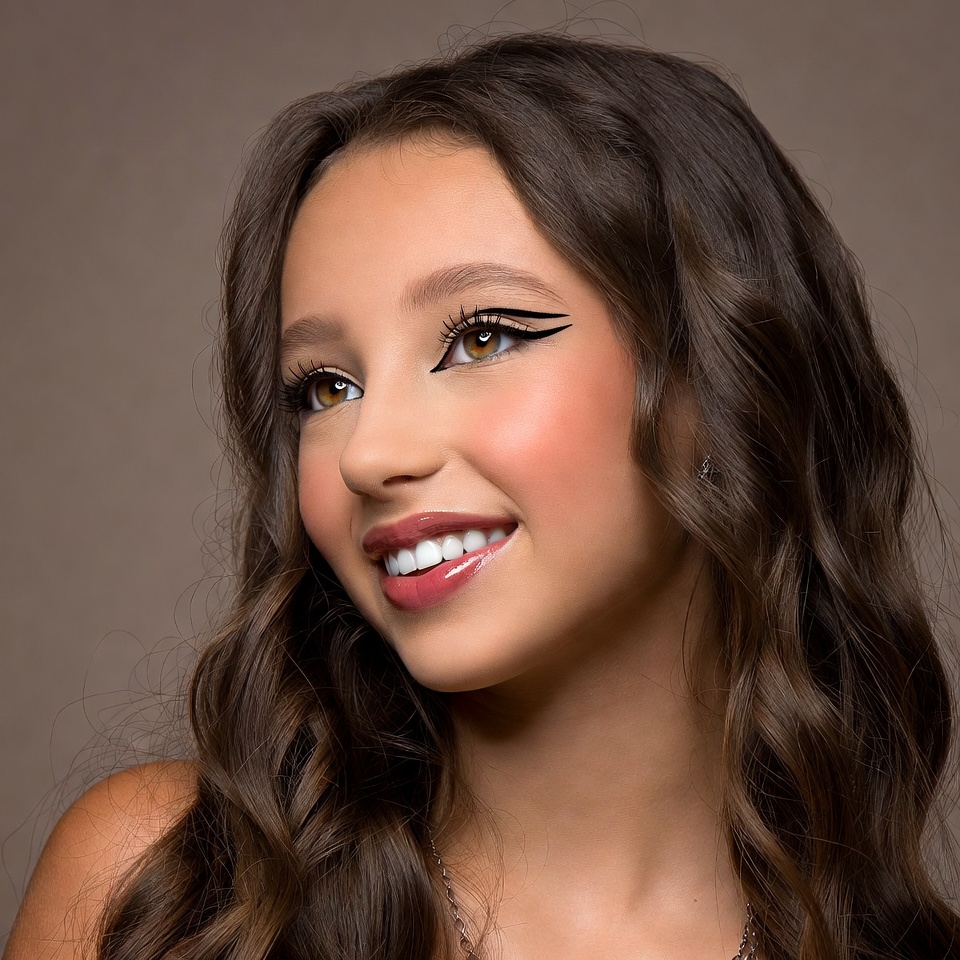 A young girl with long wavy brown hair smiles at the camera against a beige background. She has prominent black winged eyeliner, rosy cheeks, and glossy pink lips showing white teeth. She wears a delicate necklace and turns her head slightly to the side.