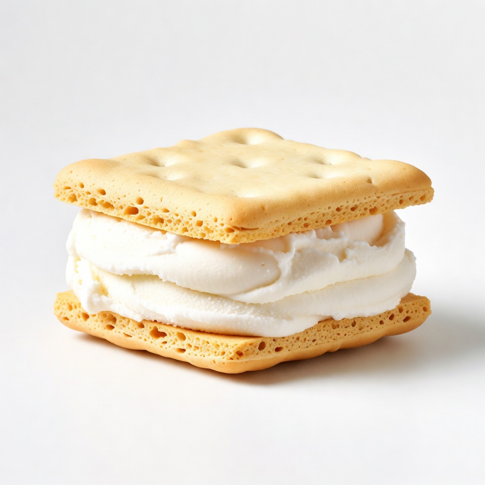 A square golden graham cracker sandwich features thick white whipped cream filling between two crisp crackers. The treat is centered on a plain white background with visible texture on the crackers. Air bubbles dot the edges of the soft cream.
