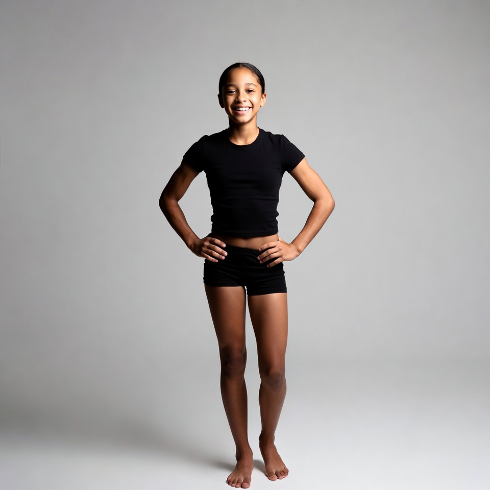 A young African-American girl stands confidently on a plain gray background with hands on her hips. She wears a black short-sleeved top and black shorts, smiling happily at the camera. Her feet are bare, and she has a slim build with shoulder-length hair.
