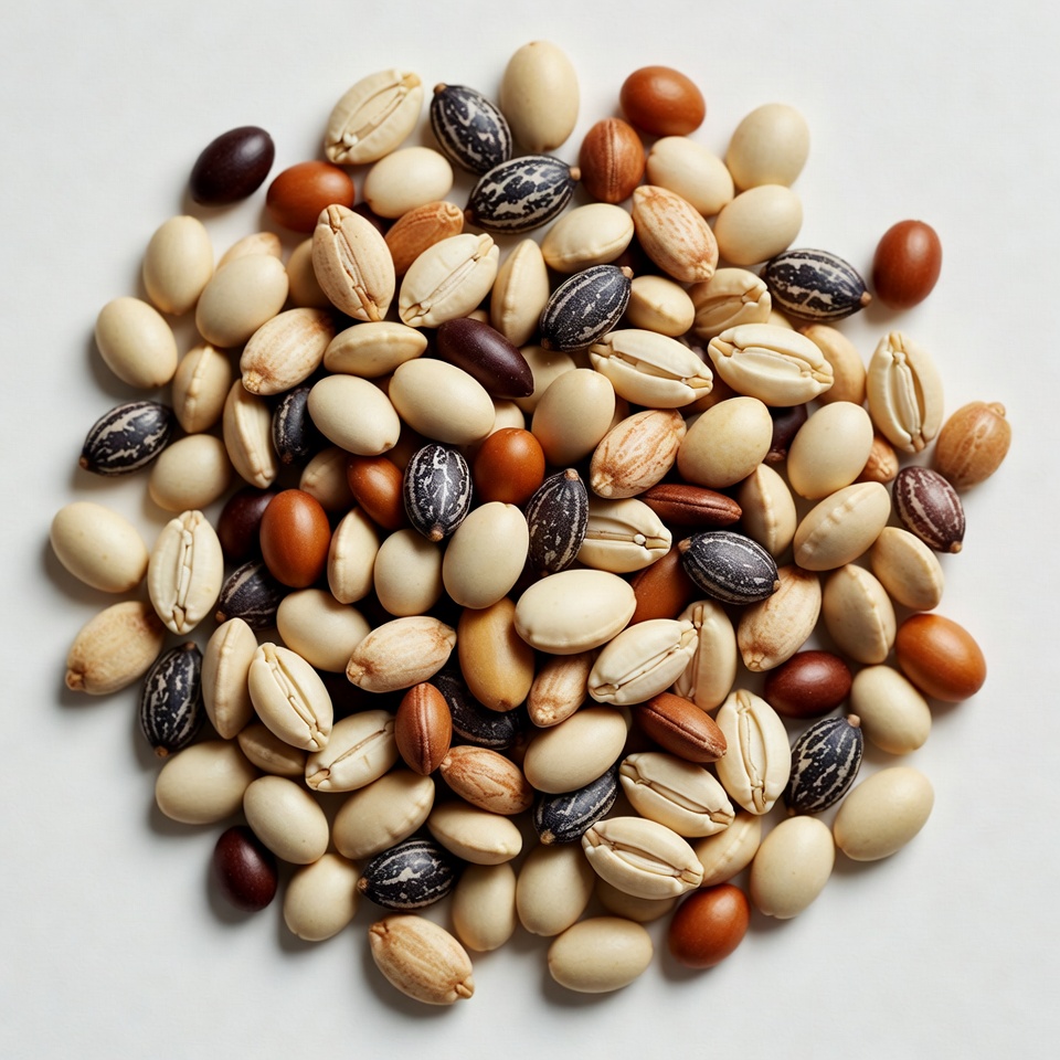 A pile of assorted beans in various colors including white, brown, black, orange, and maroon is arranged on a plain white background. The beans feature smooth and speckled textures, with some displaying striped patterns. They are clustered together in a circular formation.