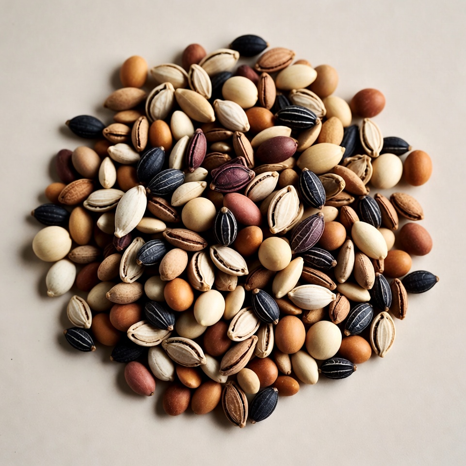 A pile of assorted seeds in various colors including beige, brown, black, purple, and maroon is arranged on a plain white background. The seeds feature diverse shapes such as oval and striped pods. They are closely packed together in a circular formation.