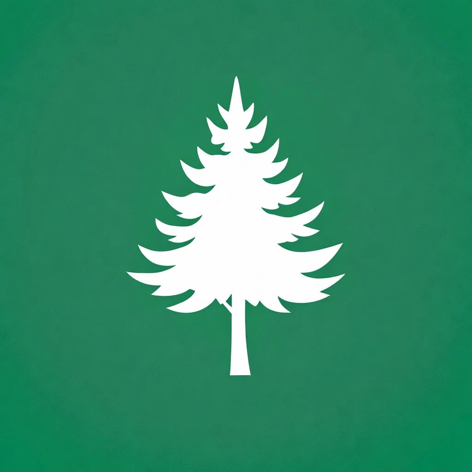 A simple white silhouette of a pine tree stands centered against a solid green background. The tree features layered triangular branches tapering to a point at the top and a thin trunk at the base. It has a clean, clipart-style design with smooth outlines.