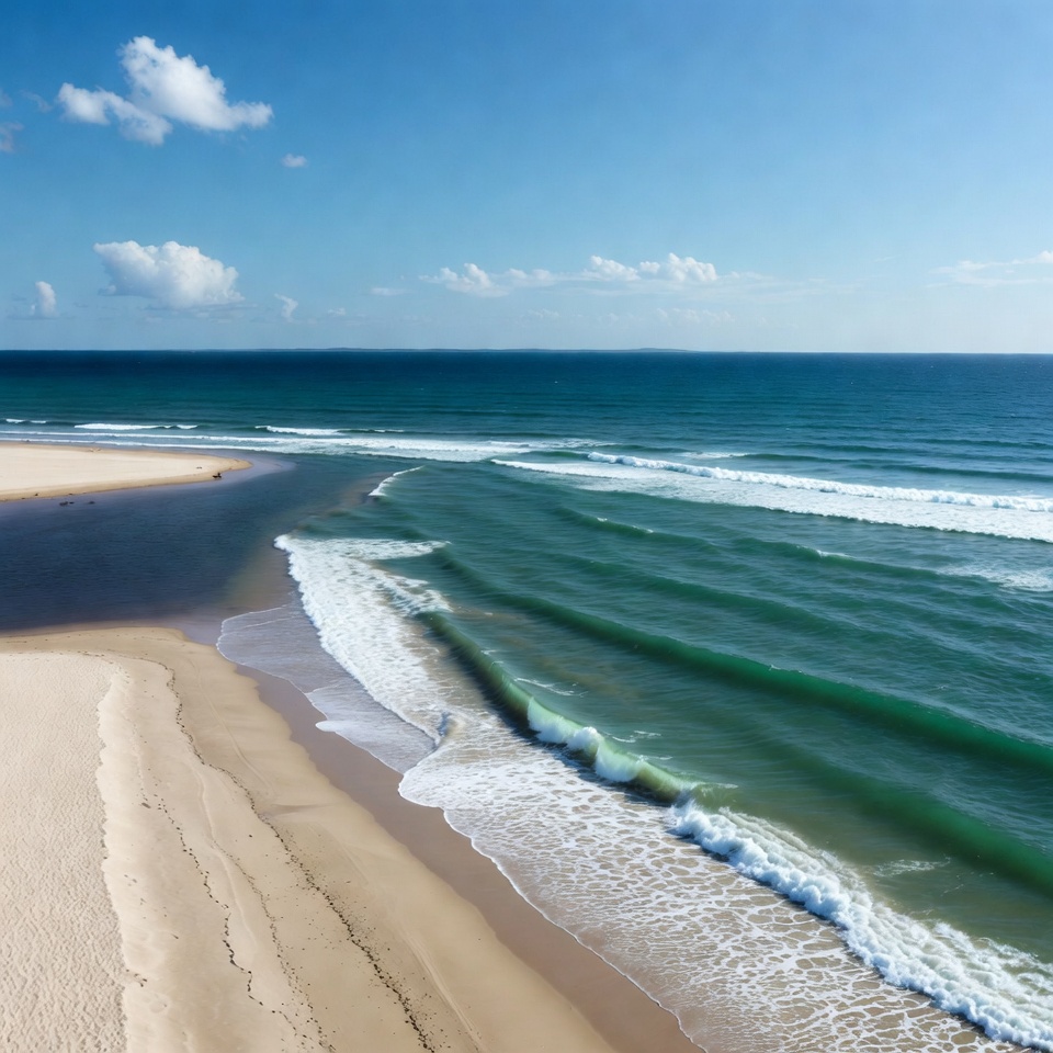 beach, blue sky, clouds, coast, crashing waves, drone photo, estuary, golden beach, landscape, nature, ocean, ocean inlet, river, sand, scenic view, sea, shoreline, surf, tropical beach, turquoise water, water meeting land, waves, white sand, aerial view