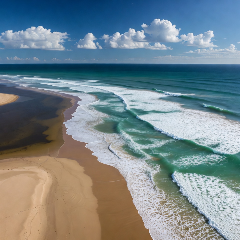 beach, beachfront, blue sky, clear sky, clouds, coastline, drone photo, golden sand, landscape, nature, ocean, ocean waves, river mouth, river outlet, sand, sandy beach, sea, shore, surf, turquoise water, water, waves, white waves, aerial view