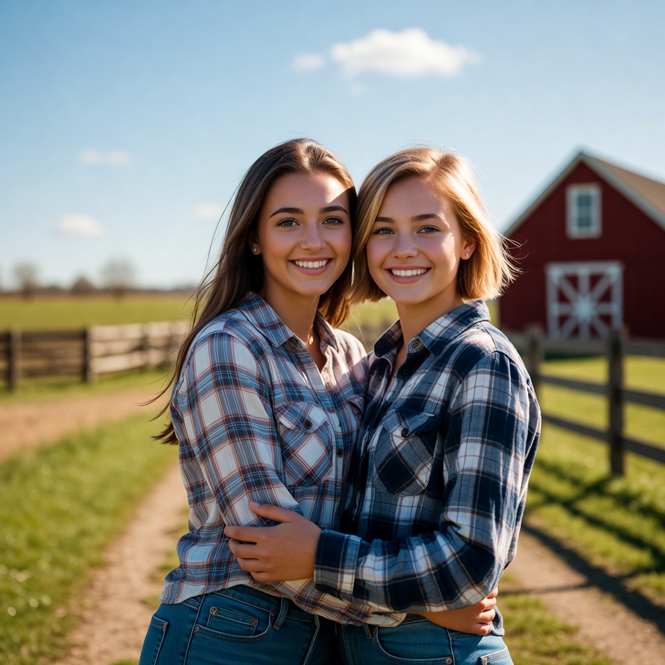 Two young women with similar features stand hugging on a dirt path in a rural field under a clear blue sky. They wear matching plaid shirts and jeans, smiling happily at the camera. A red barn and wooden fence are visible in the background with green grass surrounding them.