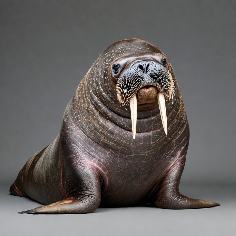 Arctic animal, animal, brown skin, flippers, gray background, long tusks, marine mammal, portrait, sea mammal, sitting walrus, tusks, whiskers, wildlife, wrinkled skin, walrus