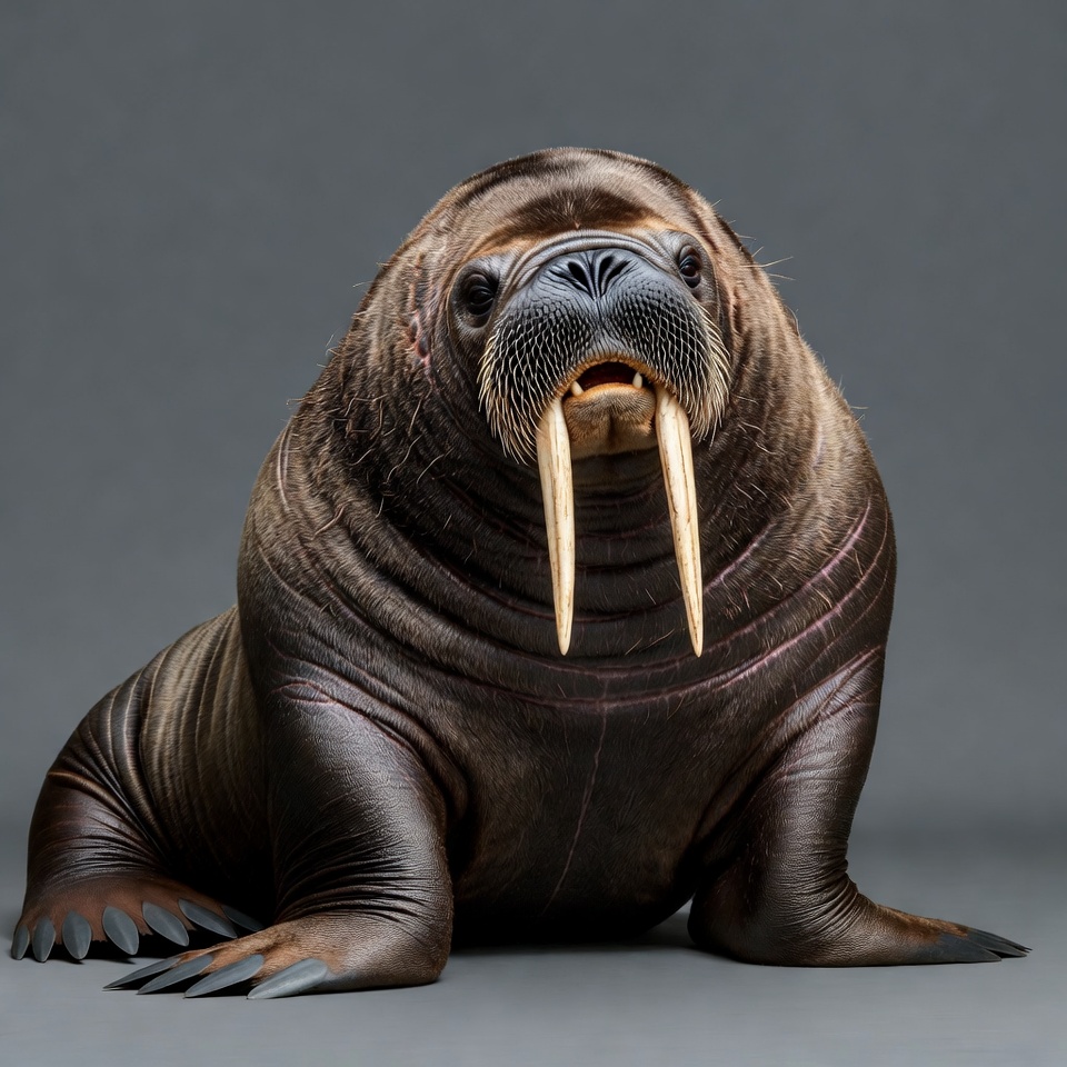Arctic animal, animal, brown fur, close-up, flippers, gray background, long tusks, marine mammal, portrait, sea mammal, sitting, tusks, whiskers, wildlife, walrus