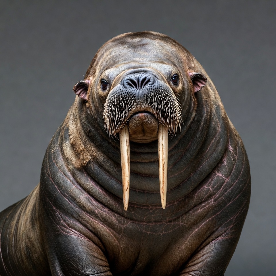 Arctic animal, animal, brown skin, close-up, fauna, gray background, long tusks, mammal, marine mammal, nature, portrait, sea mammal, small eyes, snout, tusks, whiskers, wildlife, wrinkled skin, zoo animal, walrus
