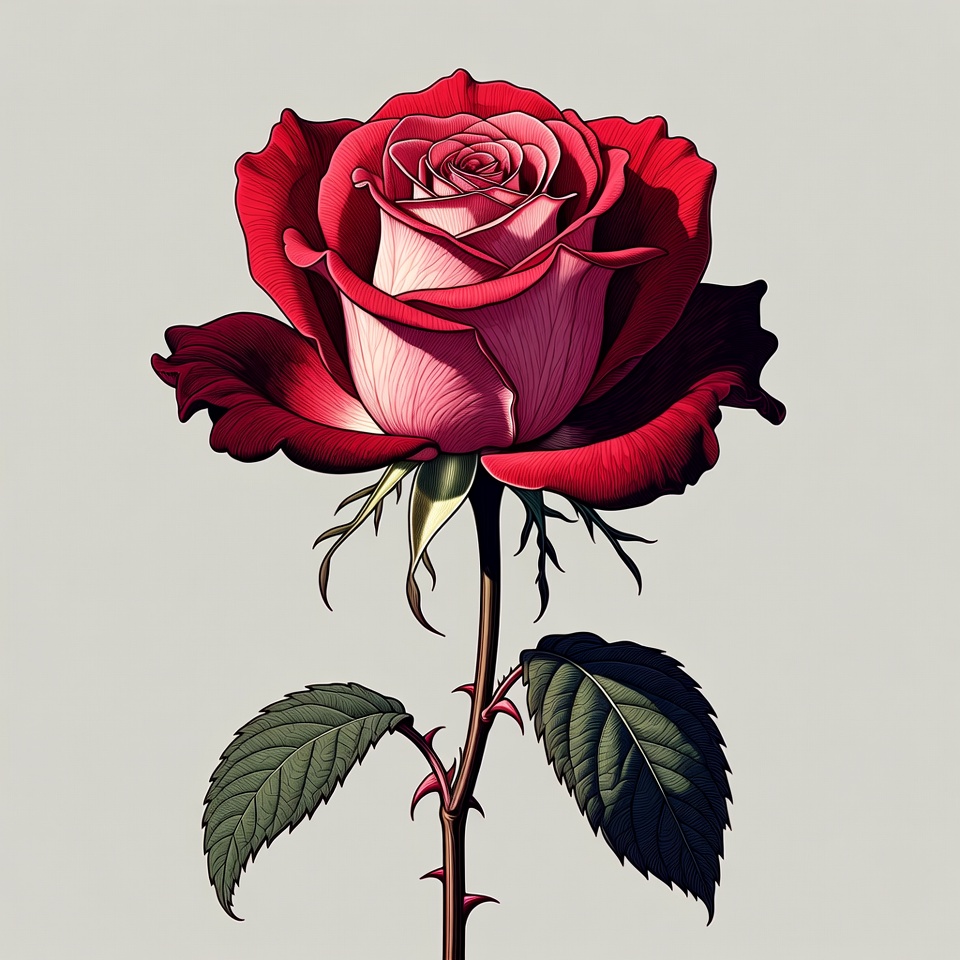 clipart style, detailed rose, digital art, floral illustration, flower art, green leaves, isolated background, petals, rose bloom, rose flower, rose illustration, single rose, stem, thorns, vibrant red, red rose