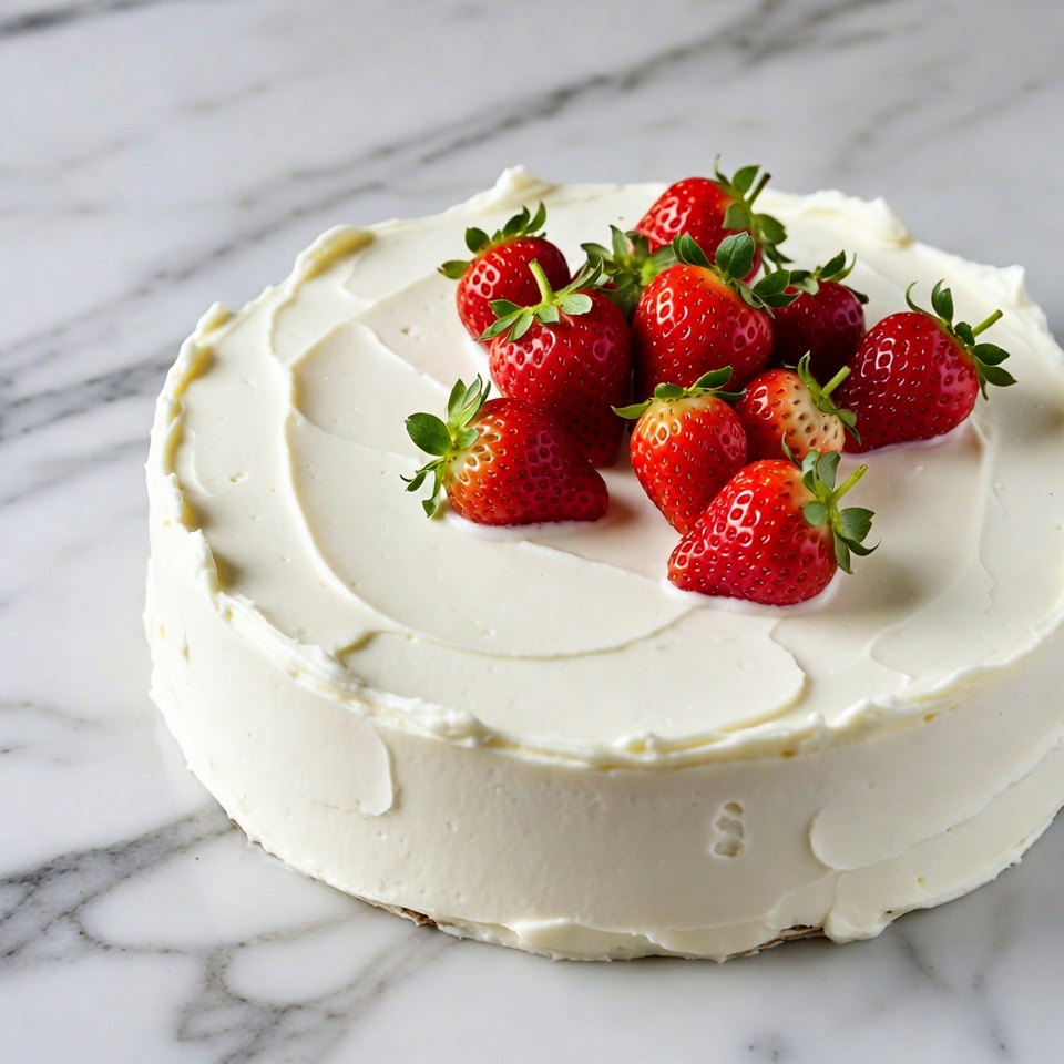 A round white-frosted cake sits on a white marble countertop. Fresh red strawberries with green leaves top the smooth white icing. The cake is centered with subtle frosting edges.