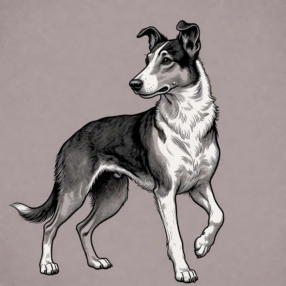 A detailed black and white illustration of a Border Collie dog stands on a light gray background. The dog has a sleek coat with black fur on its back and white on its chest, legs, and muzzle. It faces slightly to the side with perked ears and a bushy tail.