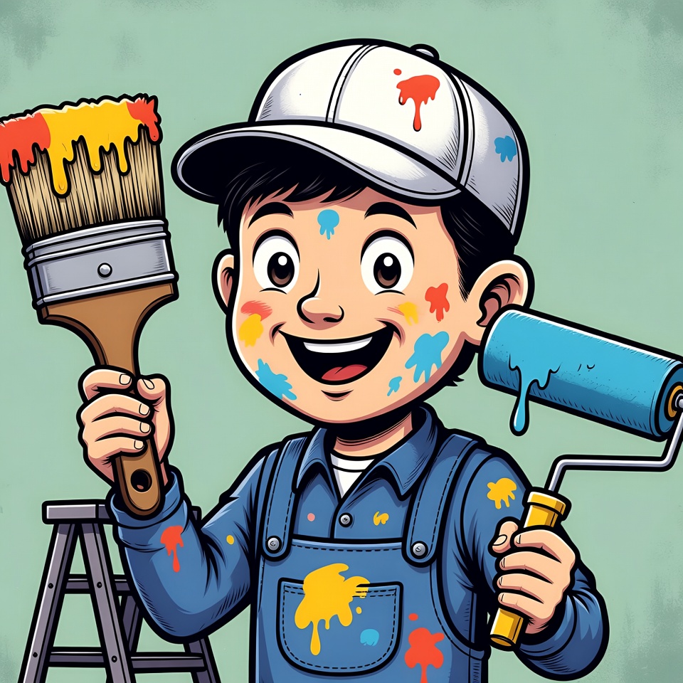 A cheerful cartoon boy with paint splatters on his face and clothes holds a yellow paintbrush in one hand and a blue paint roller in the other. He wears a white cap with paint drips and a blue jumpsuit, standing in front of a ladder on a green background. His wide smile and big eyes convey enthusiasm for painting.