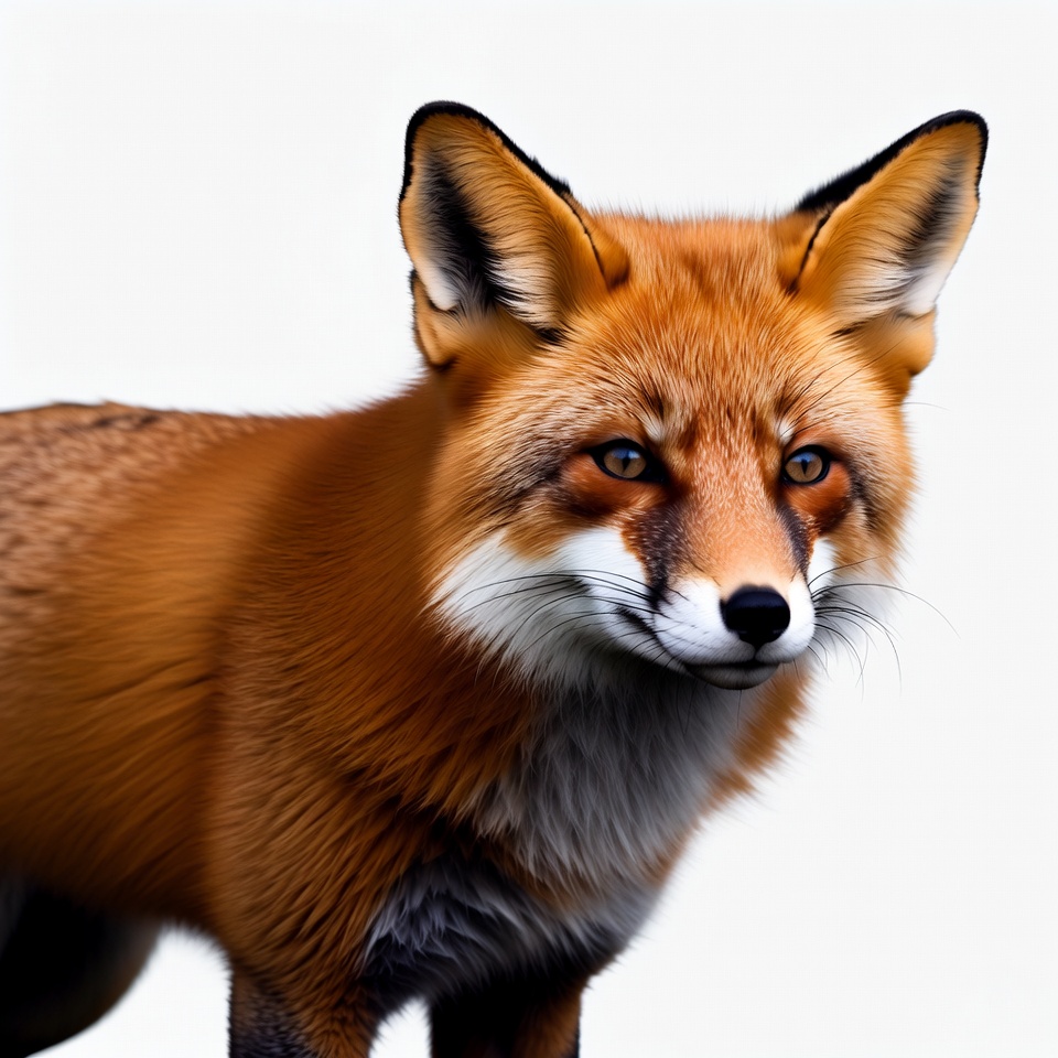 amber eyes, animal, canine, detailed fur, fluffy tail, isolated background, mammal, orange fur, pointed ears, portrait, red fox, standing, white background, white muzzle, wild animal, wildlife, fox