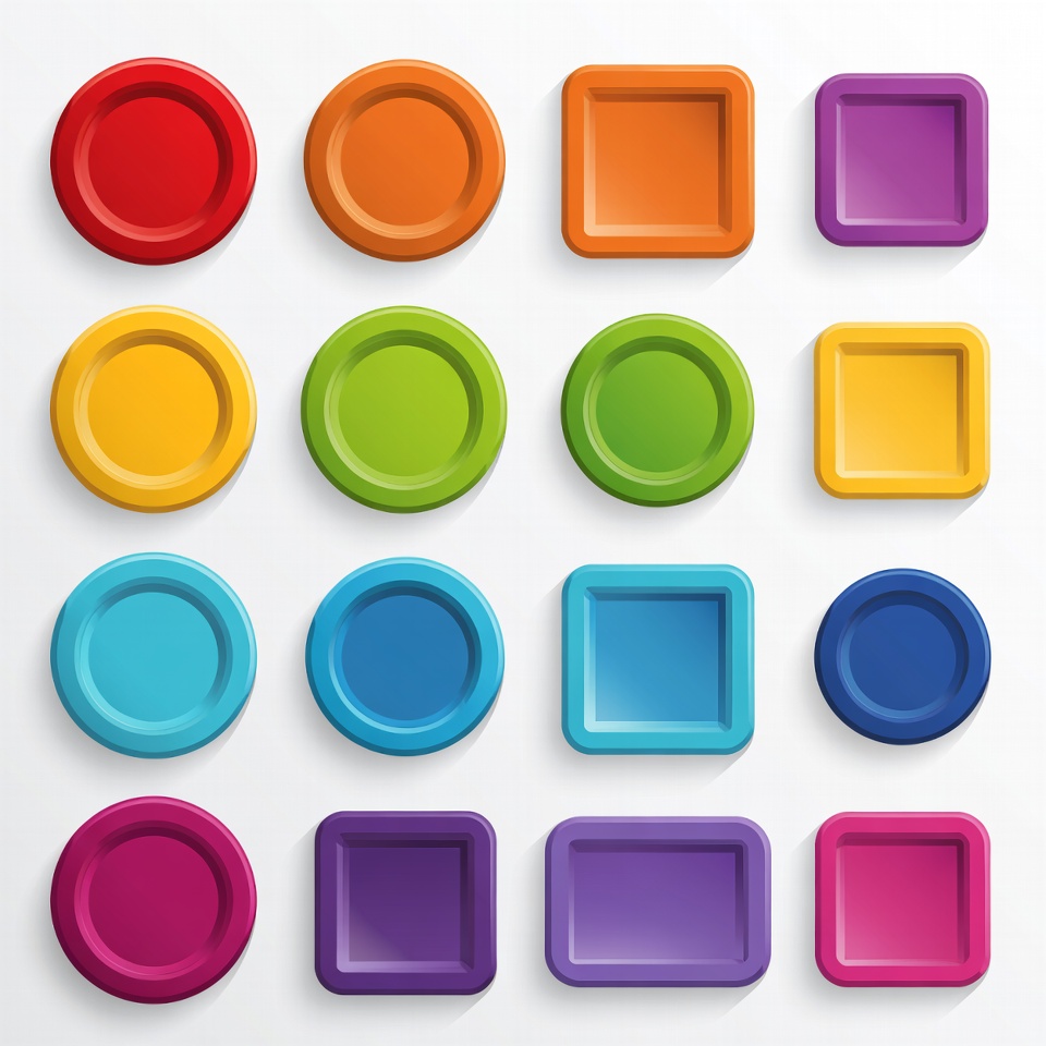 3D shapes, blue circle, blue square, bright colors, clipart, cyan circle, cyan square, geometric shapes, glossy buttons, green circle, green square, illustration, isolated background, magenta circle, magenta square, orange circle, orange square, purple circle, purple square, red circle, red square, round shapes, square shapes, vector graphics, yellow circle, yellow square, colorful shapes