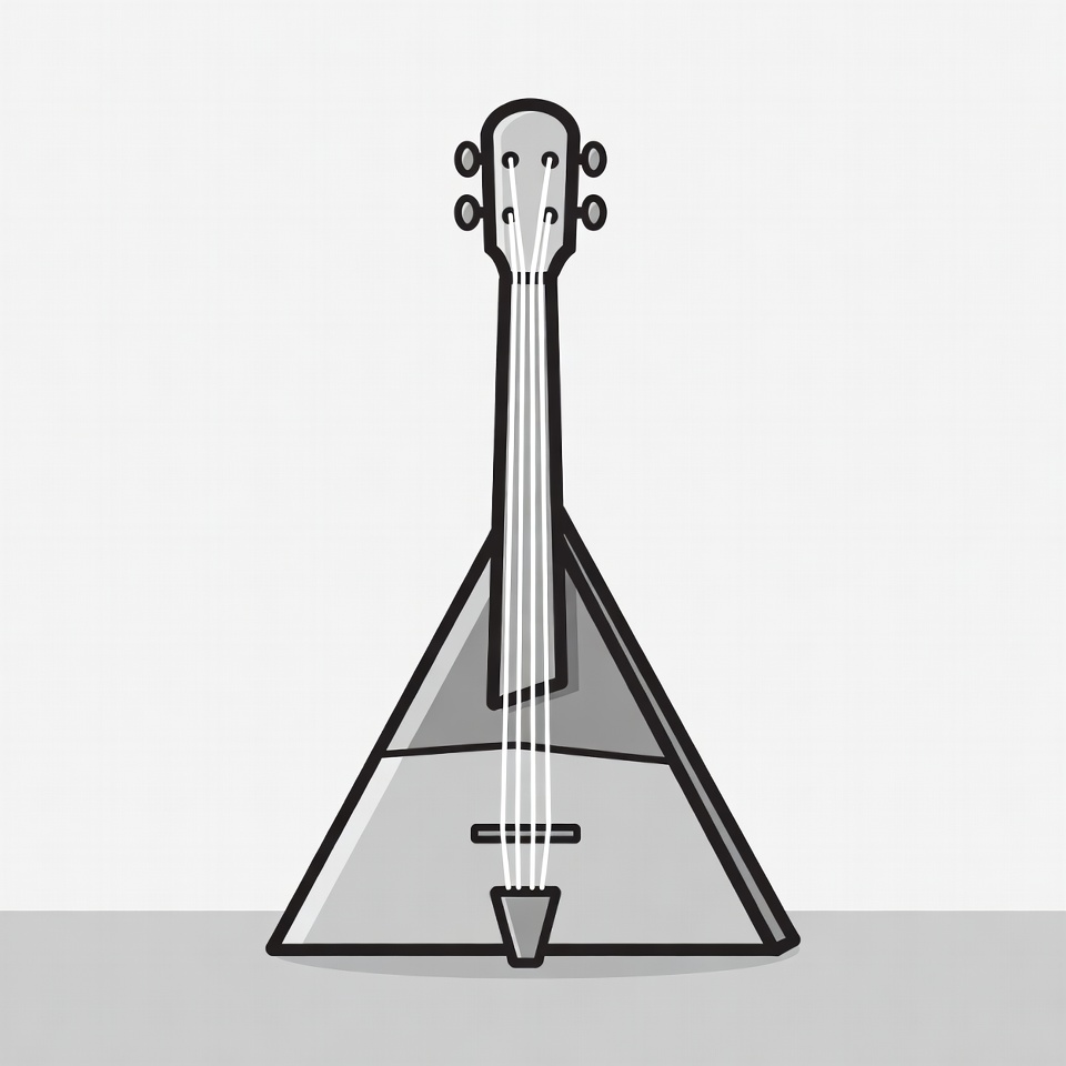 Russian music, clipart, folk instrument, gray illustration, illustration, isolated background, line art, musical instrument, neck, string instrument, three strings, triangle body, tuning pegs, vector art, balalaika