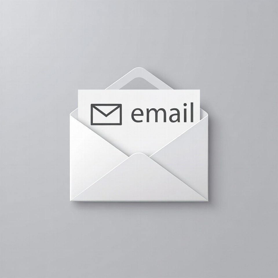 A white envelope is depicted in a 3D paper cutout style on a light gray background. The envelope is open with a paper inside labeled 'email' and an email icon. It features a handle on top for a hanging effect.