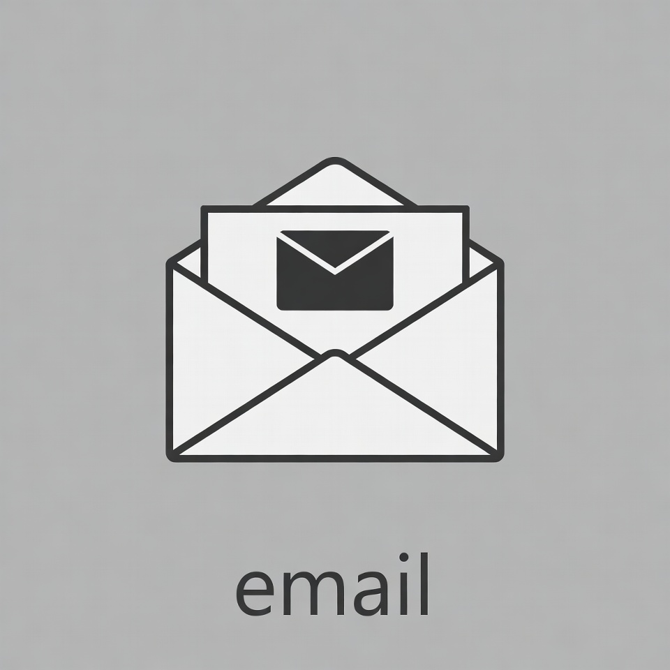 A simple black line art icon depicts an open white envelope with a letter inside. The envelope flap is lifted, revealing the folded paper. The word 'email' is written below the illustration on a gray background.