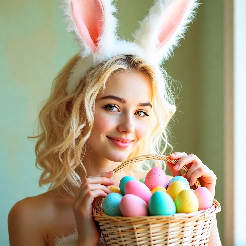 A young White woman with long blonde wavy hair wears pink bunny ears and smiles while holding a woven basket filled with colorful Easter eggs. She stands against a light green background near a window. Her expression is joyful as she grips the basket with both hands.