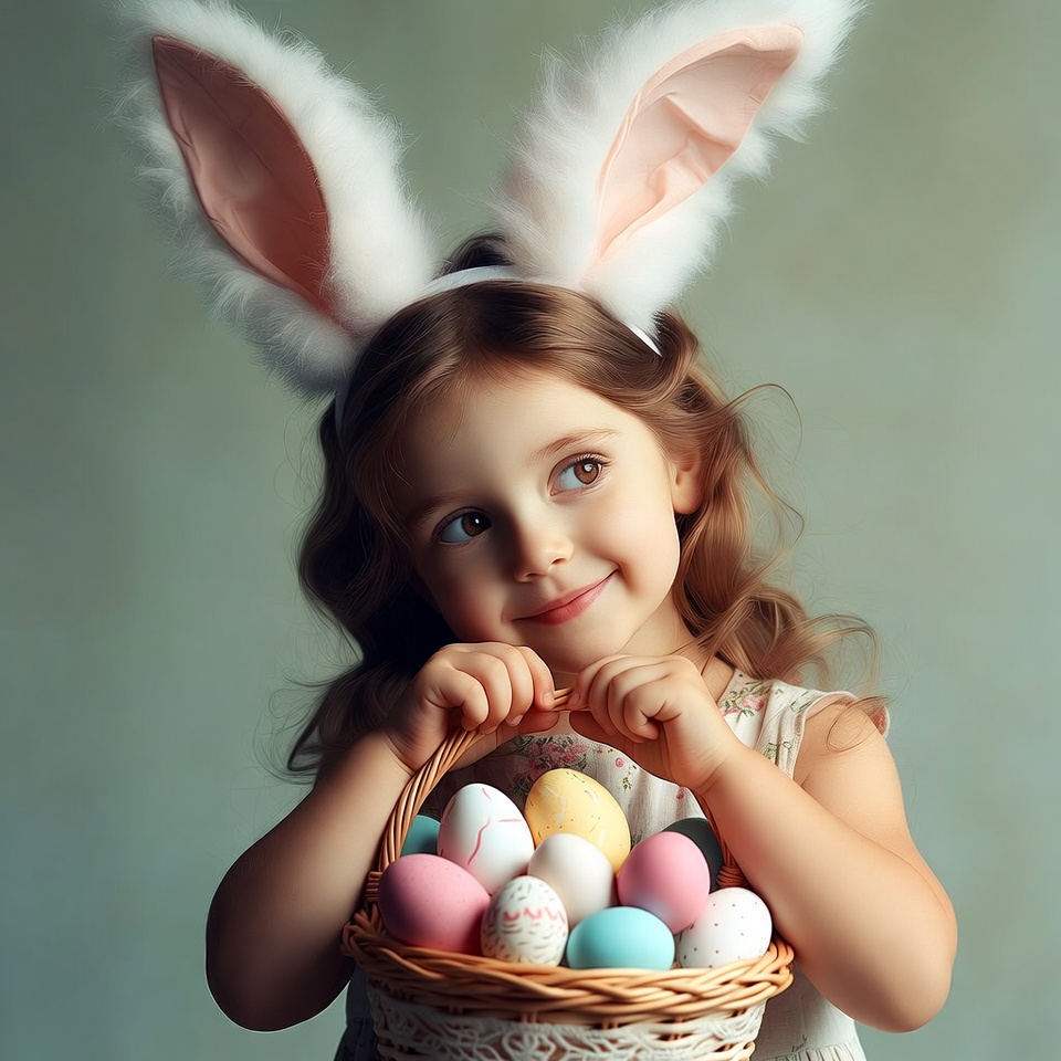 A young girl with curly brown hair and large white bunny ears on a headband smiles while holding a woven basket filled with colorful Easter eggs. She wears a light-colored dress and stands against a soft green background. Her hands gently grasp the basket as she looks thoughtfully to the side.