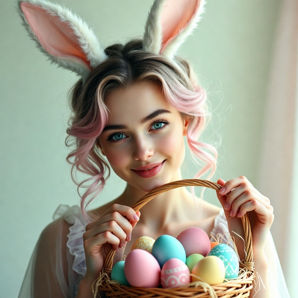 A young woman with long wavy pink-tinted hair and large white bunny ears smiles while holding a woven basket filled with colorful Easter eggs. She wears a sheer white lace dress and stands against a light green background. Her blue eyes and joyful expression are prominent.