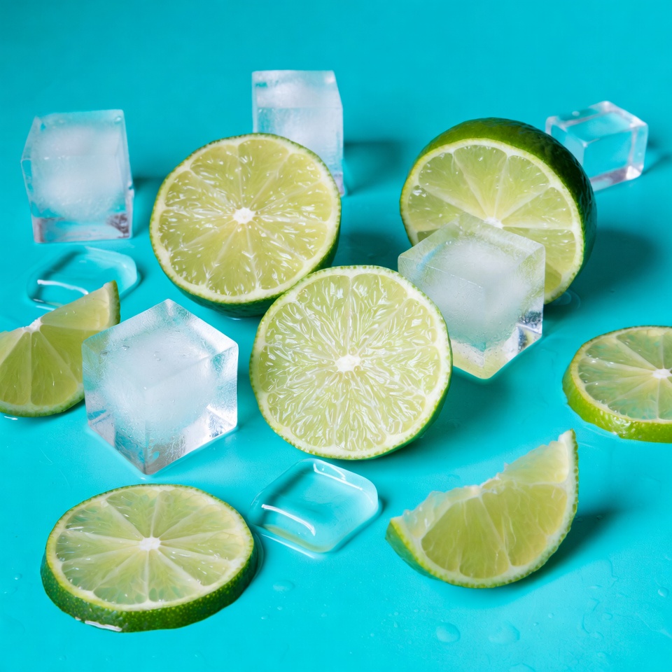 blue background, citrus, clear ice, cocktail garnish, flat lay, food photography, fresh lime, fruit, green limes, ice, ice cubes, isolated, lime cut, lime juice, lime slices, lime wedges, limes, refreshment, summer, water droplets, lime