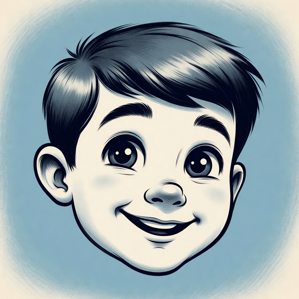 A cheerful cartoon boy with short black hair and large expressive eyes smiles happily. The illustration features bold black ink lines on a light blue rounded background. His face shows prominent cheeks and a wide grin.