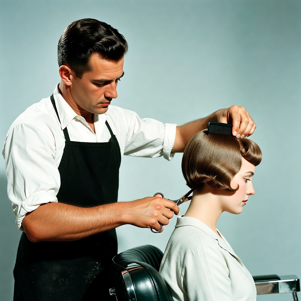 1950s, White, barber, barber chair, black apron, brown hair, client, comb, female, grooming, hair cutting, haircut, male, man, professional, retro, salon, scissors, seated woman, short hair, standing man, styling, vintage, white shirt, woman, hairdresser