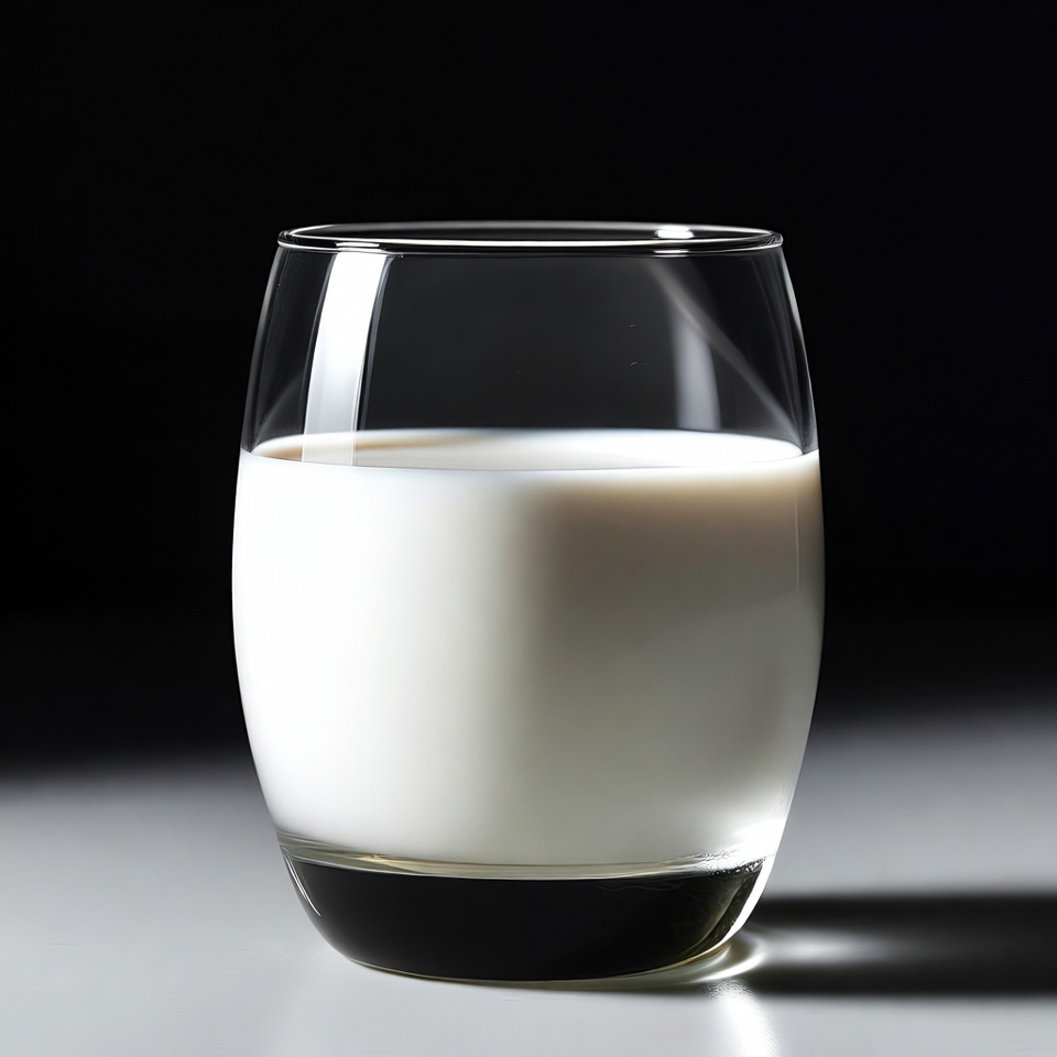 A clear glass tumbler filled with white milk sits on a dark surface. The glass has a curved shape with smooth edges and reflects light from the surroundings. The milk appears fresh and opaque against the black background.