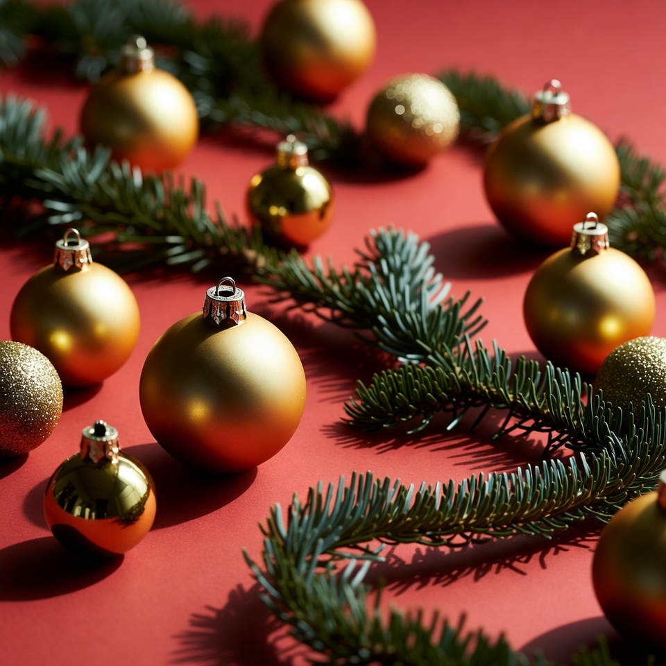 Shiny gold and glitter Christmas baubles are scattered across a vibrant red background. Fresh green pine branches weave around the ornaments, adding a festive touch. The arrangement features metallic gold spheres with hooks and subtle shadows for depth.