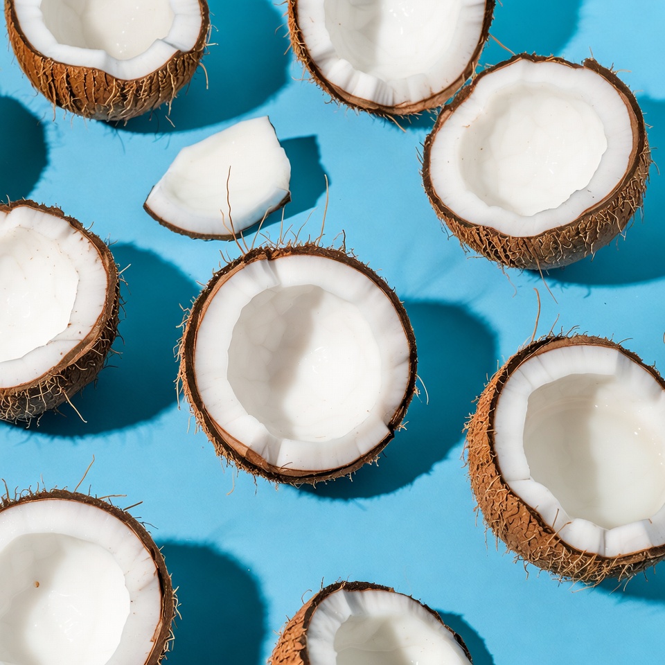 Fresh Coconut Halves on Blue Background