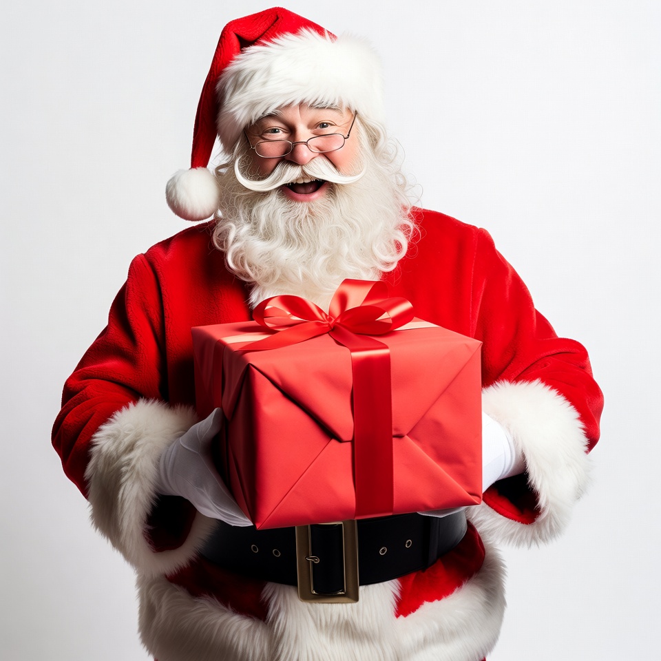 Christmas, Santa, Santa hat, White, black belt, festive, gift box, glasses, holding gift, holiday, isolated background, man, red gift, red suit, smiling Santa, white beard, white fur, Santa Claus