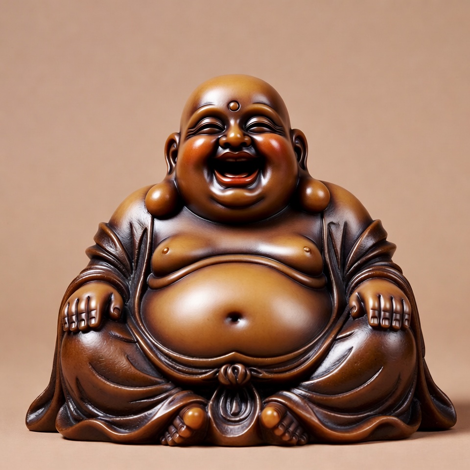 Asian, Buddha statue, bald head, beige background, bronze statue, ceramic figurine, chubby Buddha, crossed legs, happy Buddha, isolated background, large ears, male, meditation pose, red dot, robes, sitting Buddha, smiling face, Laughing Buddha