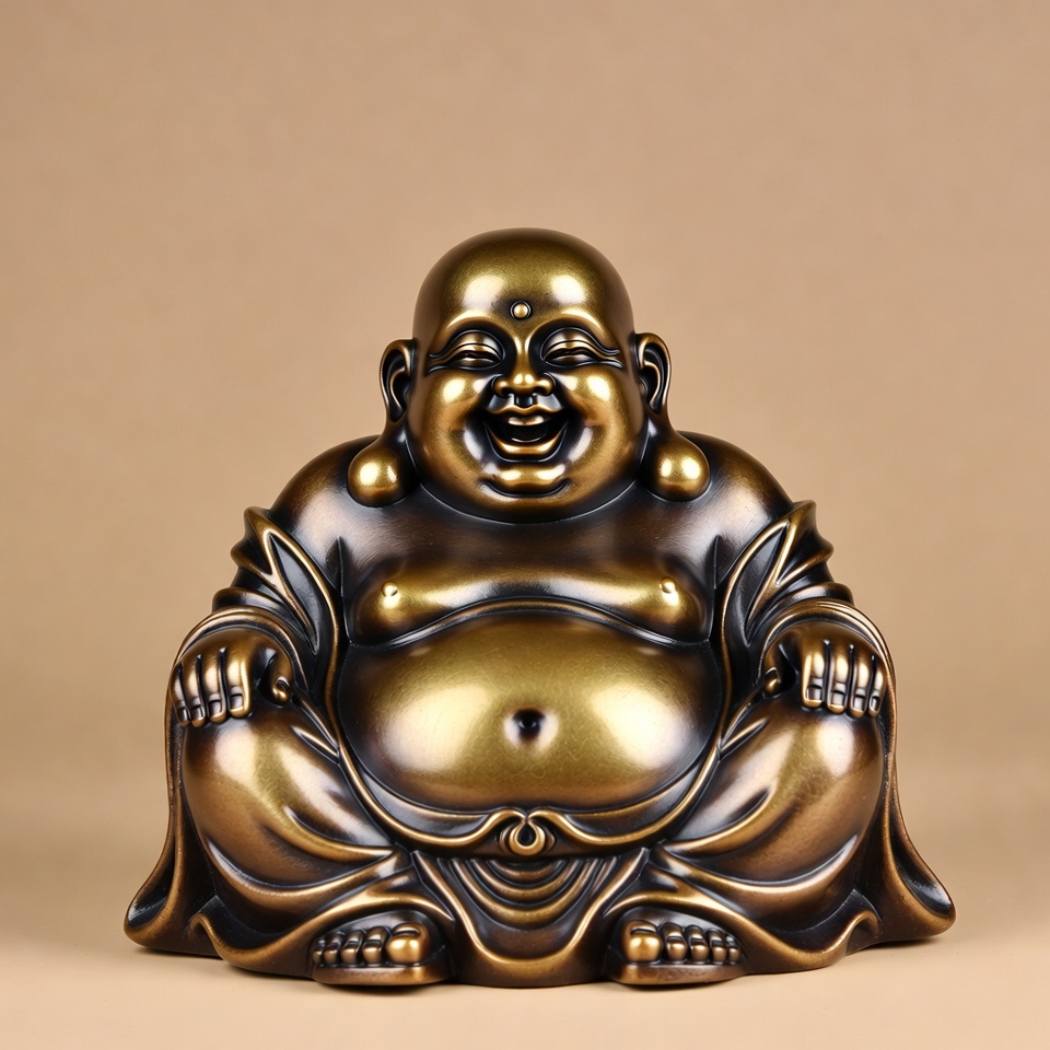 A golden bronze statue of the Laughing Buddha sits in a meditative pose with hands resting on knees. The plump figure has a joyful smiling face, large ears, and wears flowing robes. It is centered against a plain beige background.