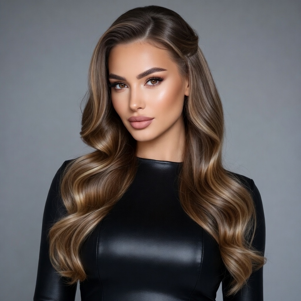 A young woman with long wavy brown hair gazes at the camera with striking makeup and full lips. She wears a shiny black leather top that accentuates her figure. The image features a plain gray background, highlighting her portrait.
