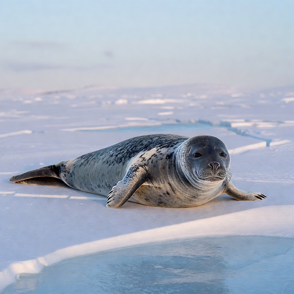 A young harbor seal with spotted gray fur lies on a snow-covered ice floe in a cold Arctic environment. It rests with front flippers extended and gazes toward the camera. The background features blue sky, ice chunks, and open water.