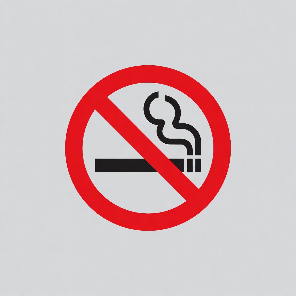 A red circular prohibition sign features a black cigarette with smoke crossed out by a diagonal slash. The icon is centered on a plain gray background. The design is simple and bold for clear visibility.