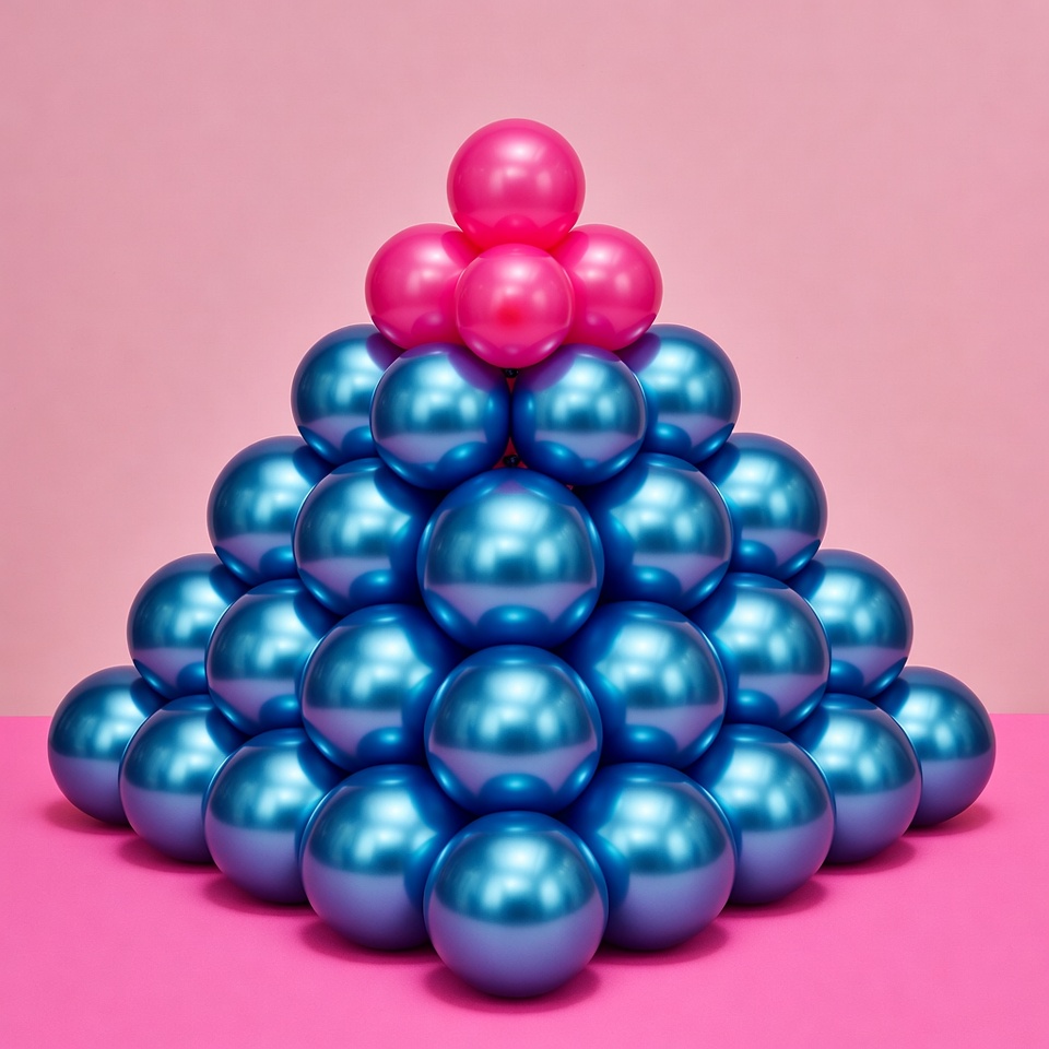 A pyramid of shiny blue balloons forms the base on a pink background. Five vibrant pink balloons sit atop the pyramid, with one prominent at the peak. The balloons have a glossy, reflective surface and are arranged in a precise stack.