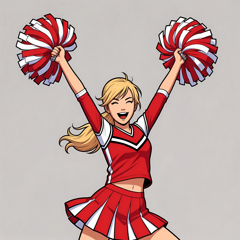 A blonde girl in a red and white cheerleader uniform jumps with arms raised, holding large red and white pom poms in each hand. She has a big smile on her face and long hair flowing behind her. The illustration is on a plain gray background.